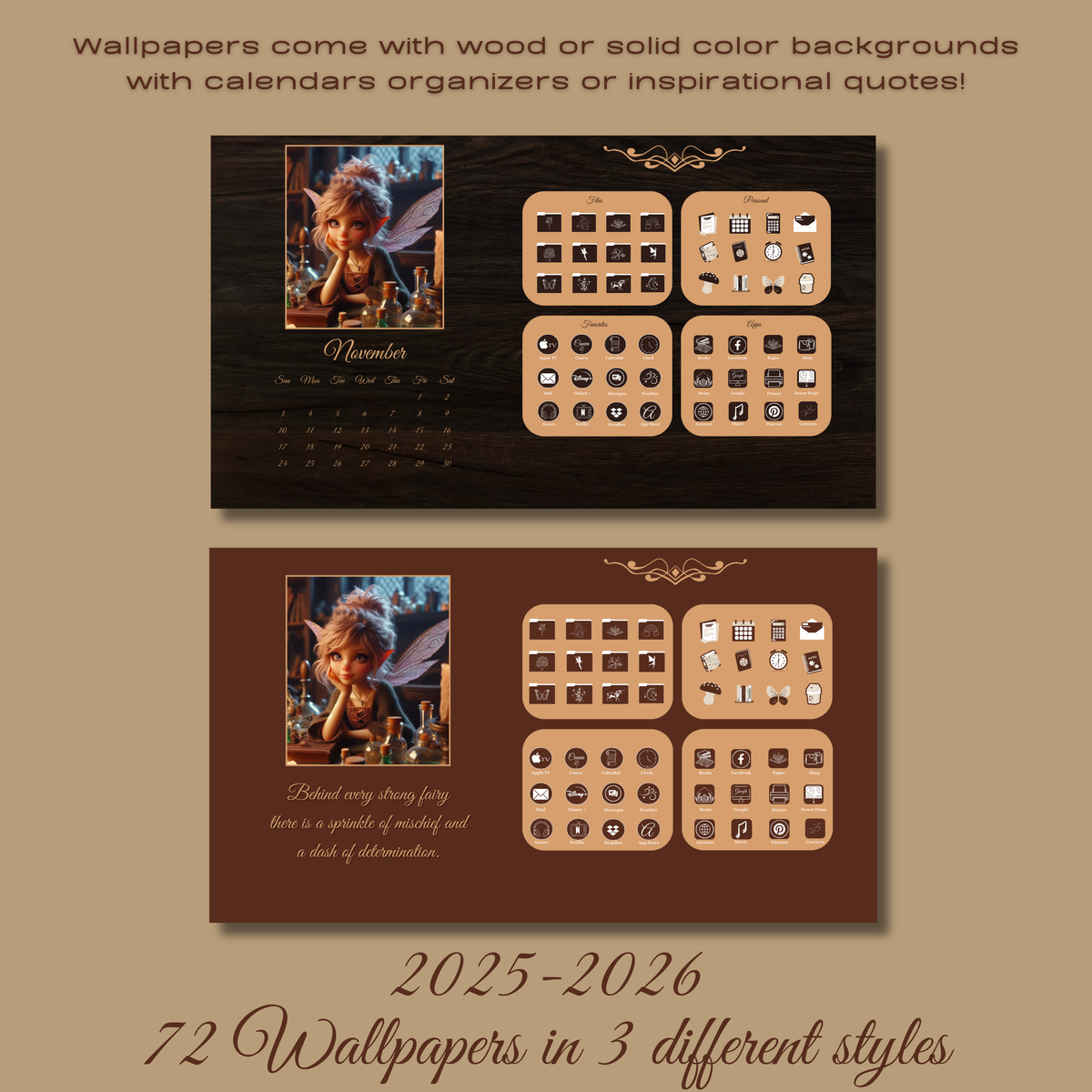-76 Wallpaper Organizers for each year to fit all screen ratios from Macs, Macbooks, iMacs, Windows Laptops & Windows Desktop Computers. 4 Different Wallpaper Options are Included (Full photo background and smaller photo with wood or brown background with calendars or quotes) 12 Different Fairies to choose from!