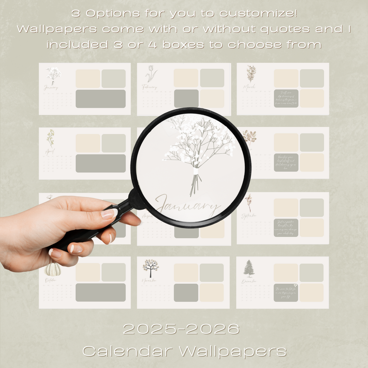 -36 Wallpaper Organizers for each year to fit all screen ratios from Macs, Macbooks, iMacs, Windows Laptops & Windows Desktop Computers. 3 Different Wallpaper Options are Included (3 boxes, 4 Boxes, and 4 Boxes with Quotes)!