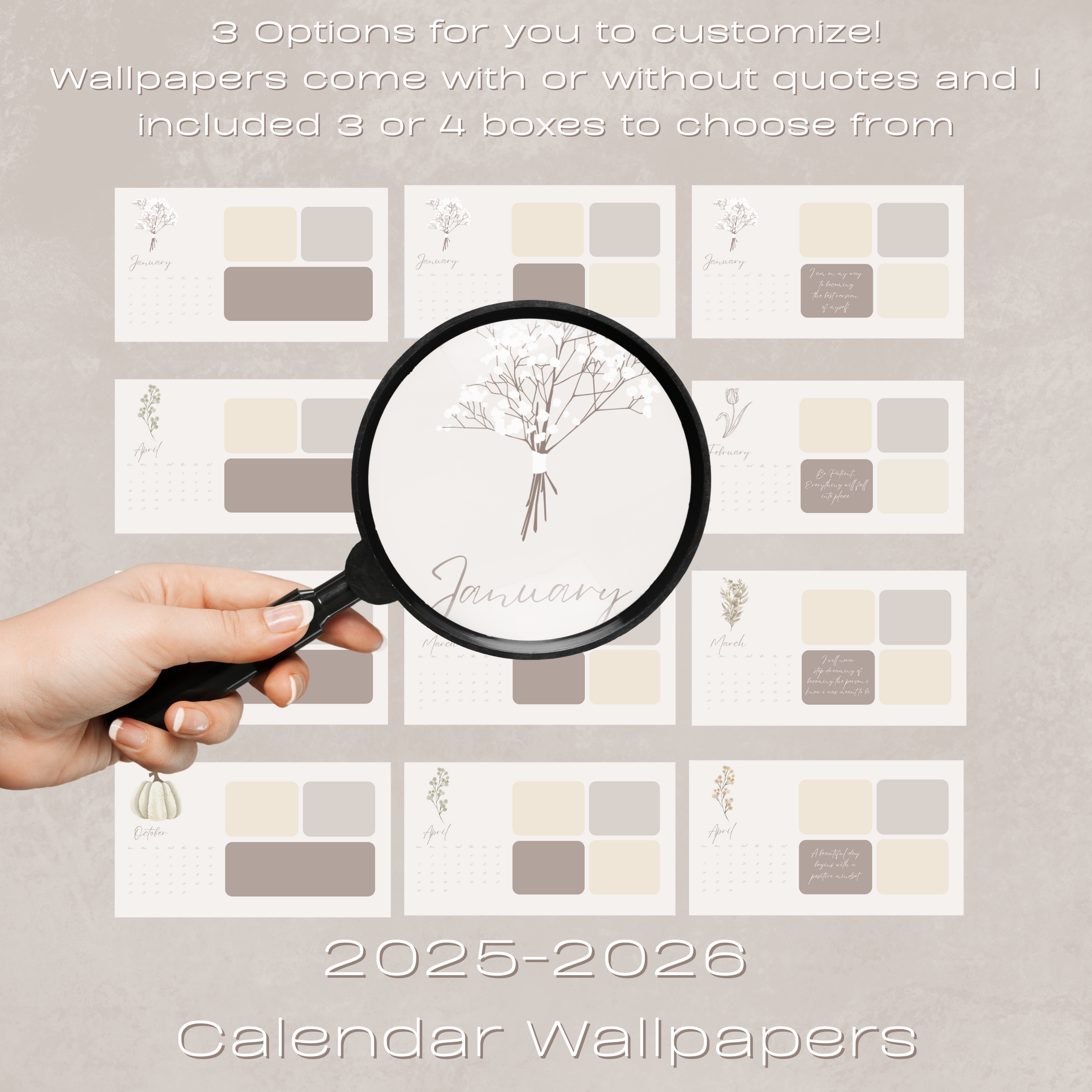 —36 Wallpaper Organizers for each year to fit all screen ratios from Macs, Macbooks, iMacs, Windows Laptops, and Windows Desktop Computers. Three different Wallpaper Options are Included (3 boxes, 4 Boxes, and 4 Boxes with Quotes)!